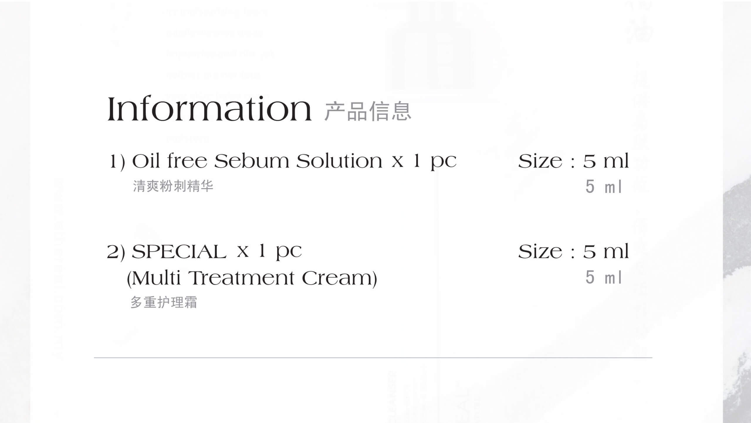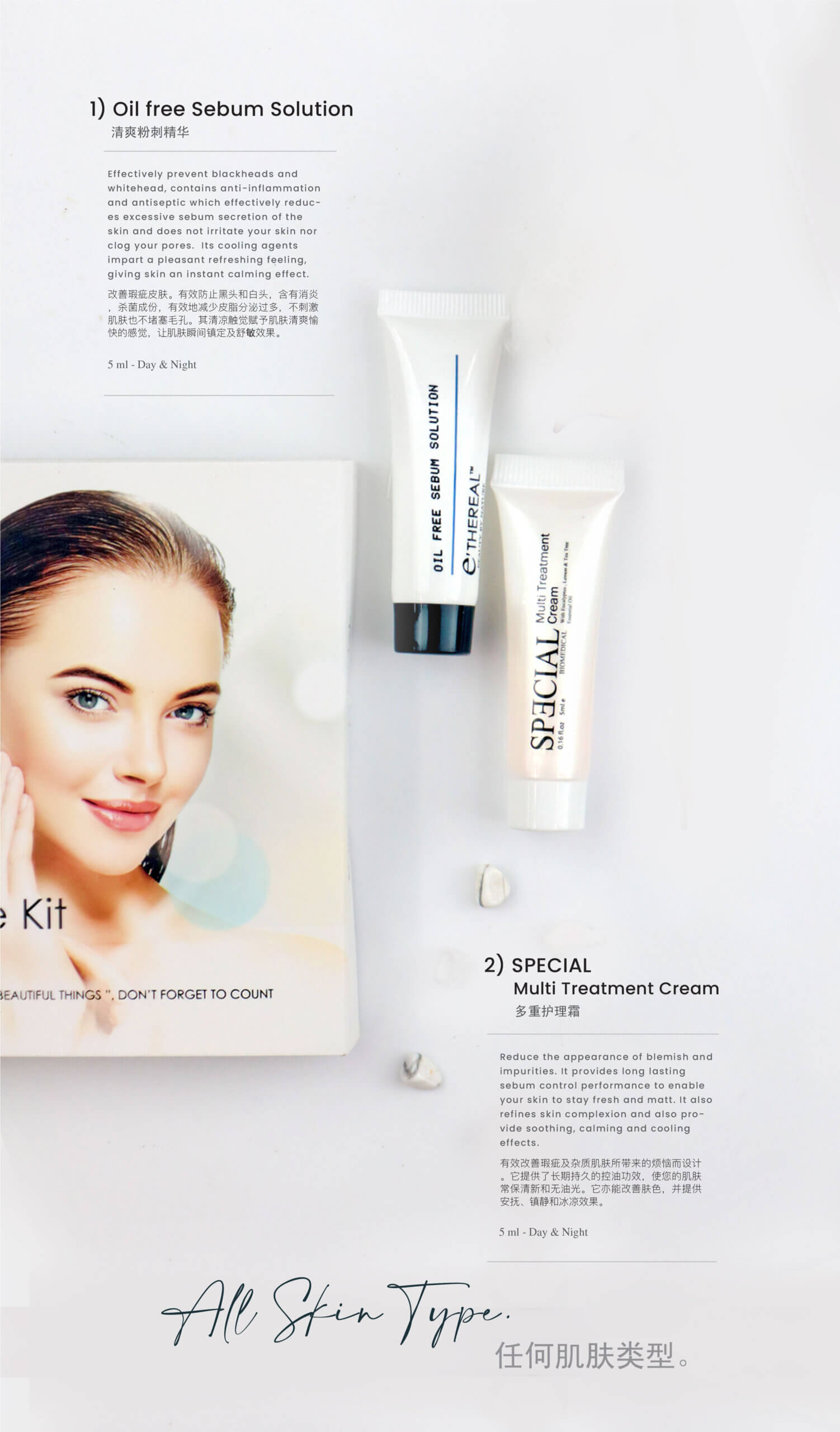 Acne Solution: Suitable for day & night – After cleansing and toning, apply Oil Free Sebum Solution adequately onto affected area or over the face. Then, apply Multi Treatment Cream over the face.
