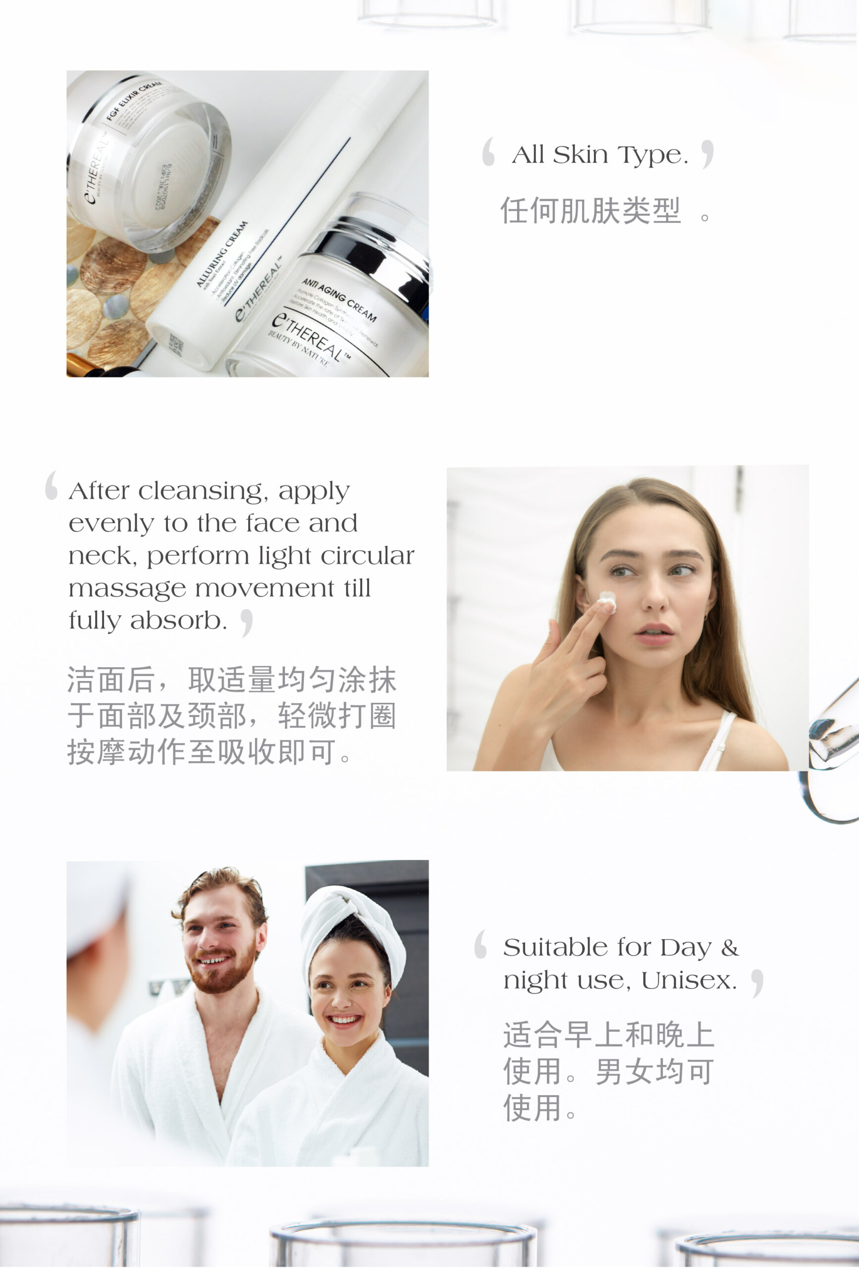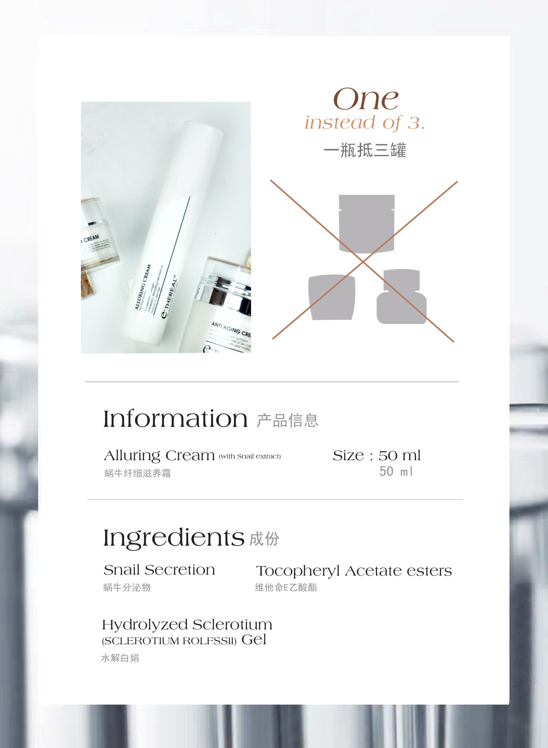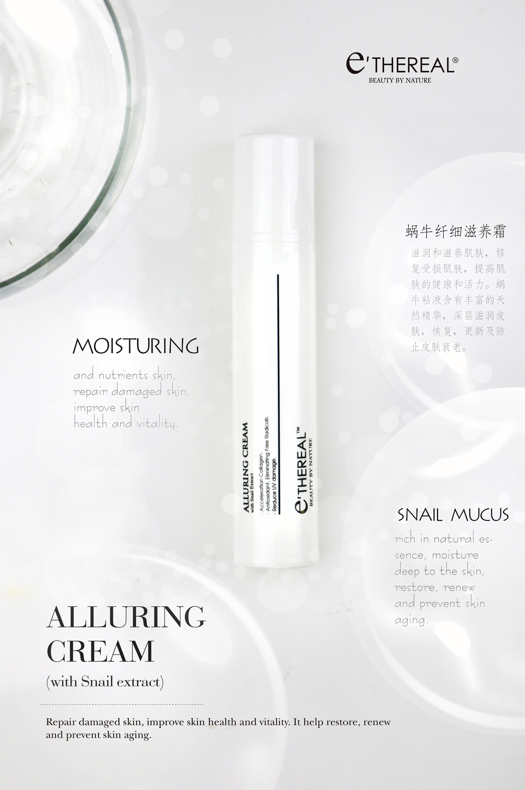 Enriched with the key ingredient of snail secretion filtrate to nourish skin and prevent skin from aging. Alluring Cream minimizes UV damage to the skin and stimulates collagen production, effectively reducing wrinkles and enhancing skin elasticity.