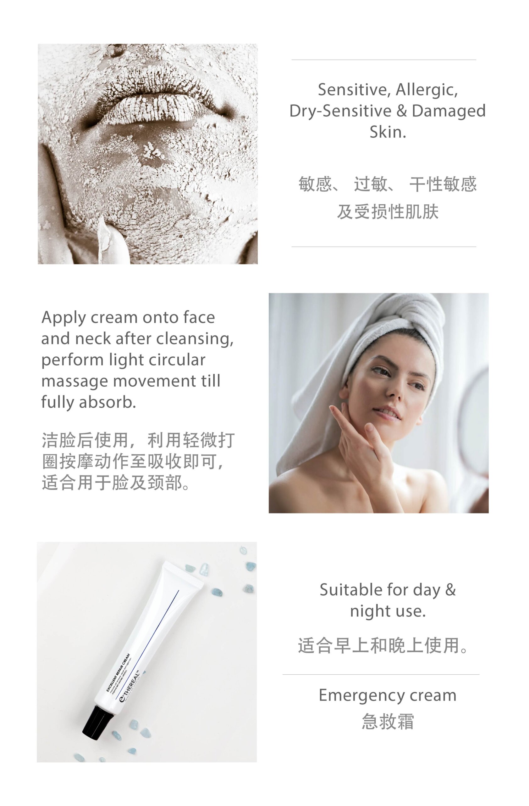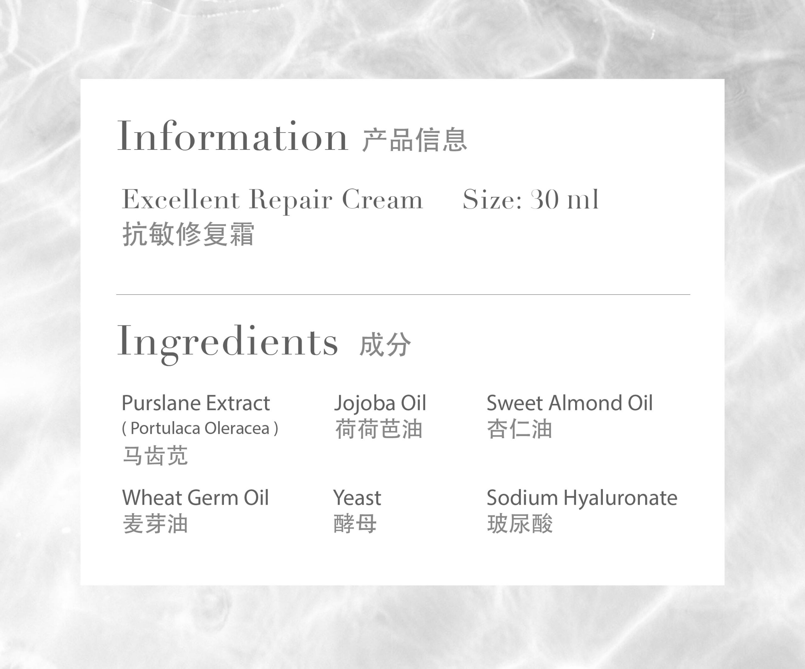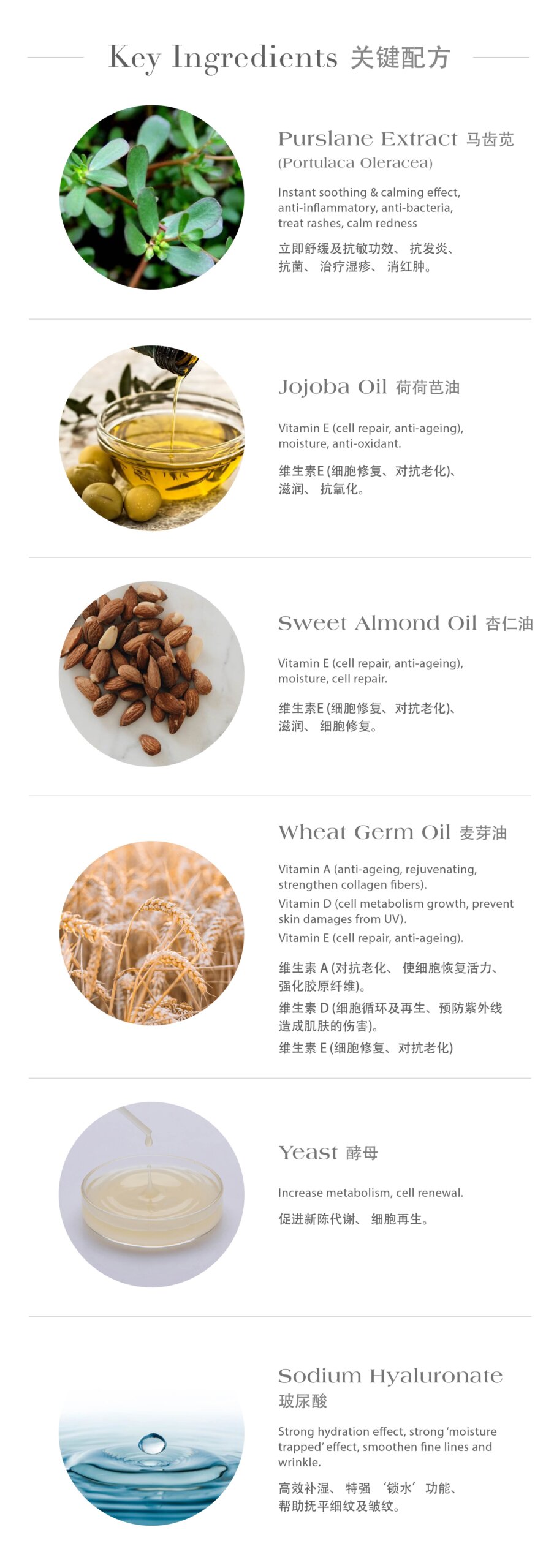 A moisturizer that soothes and repairs dry, sensitive, damaged skin. It calms redness and irritation while providing the necessary moisture and nutrients with Purslane Extract, Jojoba Oil, Sweet Almond Oil, Wheat Germ Oil, Yeast, and Sodium Hyaluronate.