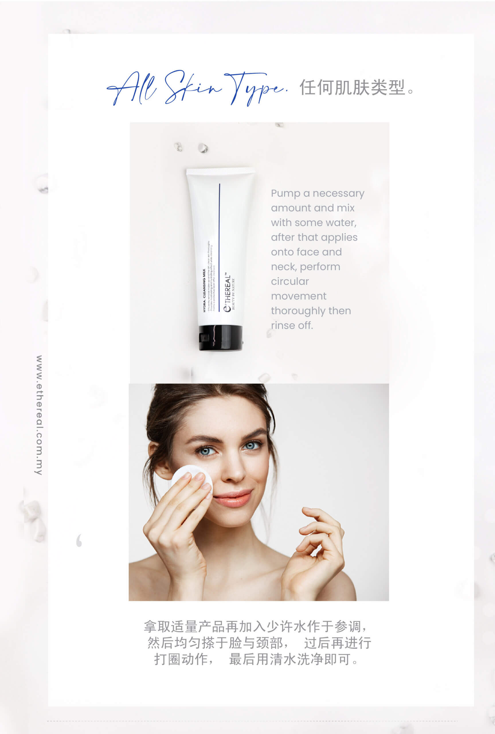 To remove makeup, sunscreen, oil, and dirt. Provides moisturizing and hydrating effects while cleansing. Forms a protective layer after cleansing, leaving the skin full of moisture and softness.