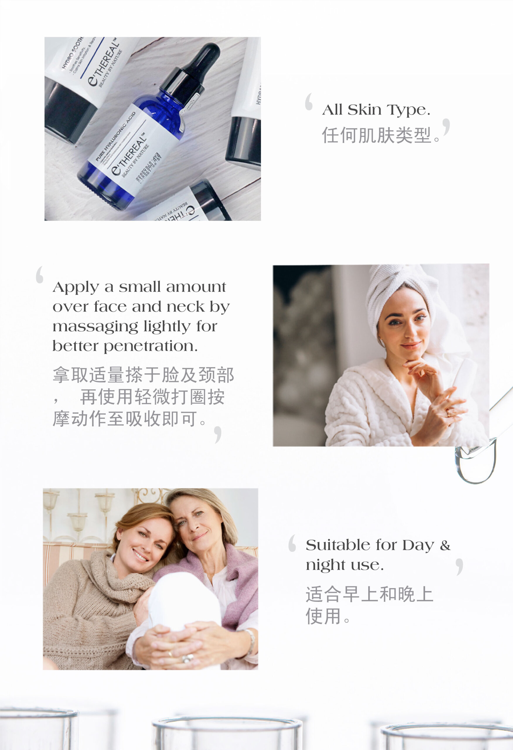 Hydrates every layer of your skin with small molecules of Hyaluronic Acid. These molecules bind moisture, plumping the skin, and are retained in the skin’s connective tissue, effectively counteracting wrinkles in the long term. Naturally present in our body and skin, Hyaluronic Acid supports skin elasticity. However, its levels decrease with age, leading to a loss of elasticity and radiance. Maintain optimal Hyaluronic Acid levels with our PHA, hydrating your skin and helping prevent wrinkles and fine lines.