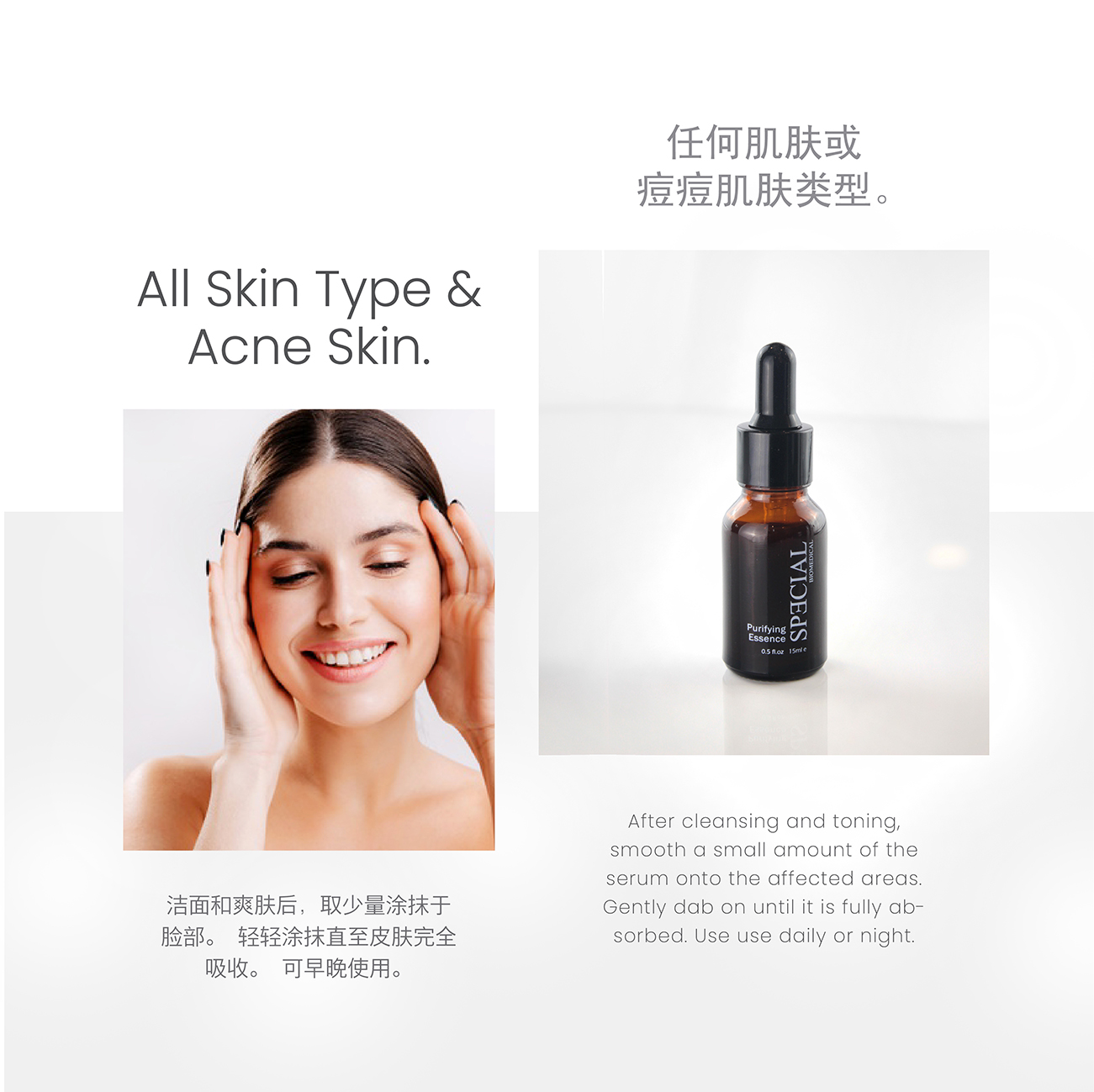 An essence that effectively minimize blemishes and impurities with Purifying Essence, featuring anti-inflammatory properties to soothe and calm irritated, oily and acne-prone skin. Other than reducing the appearance of blemishes, it also works to moisturize skin and tighten pores.