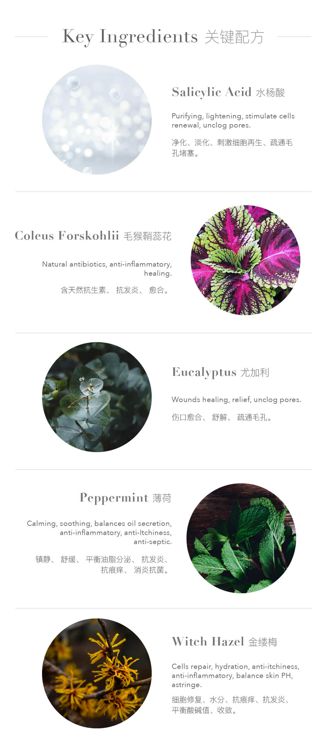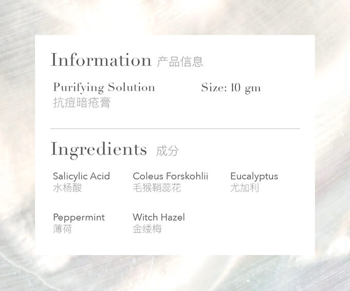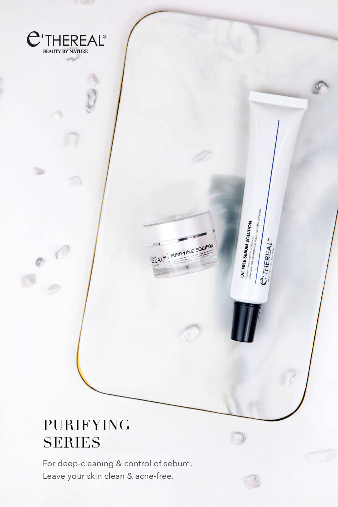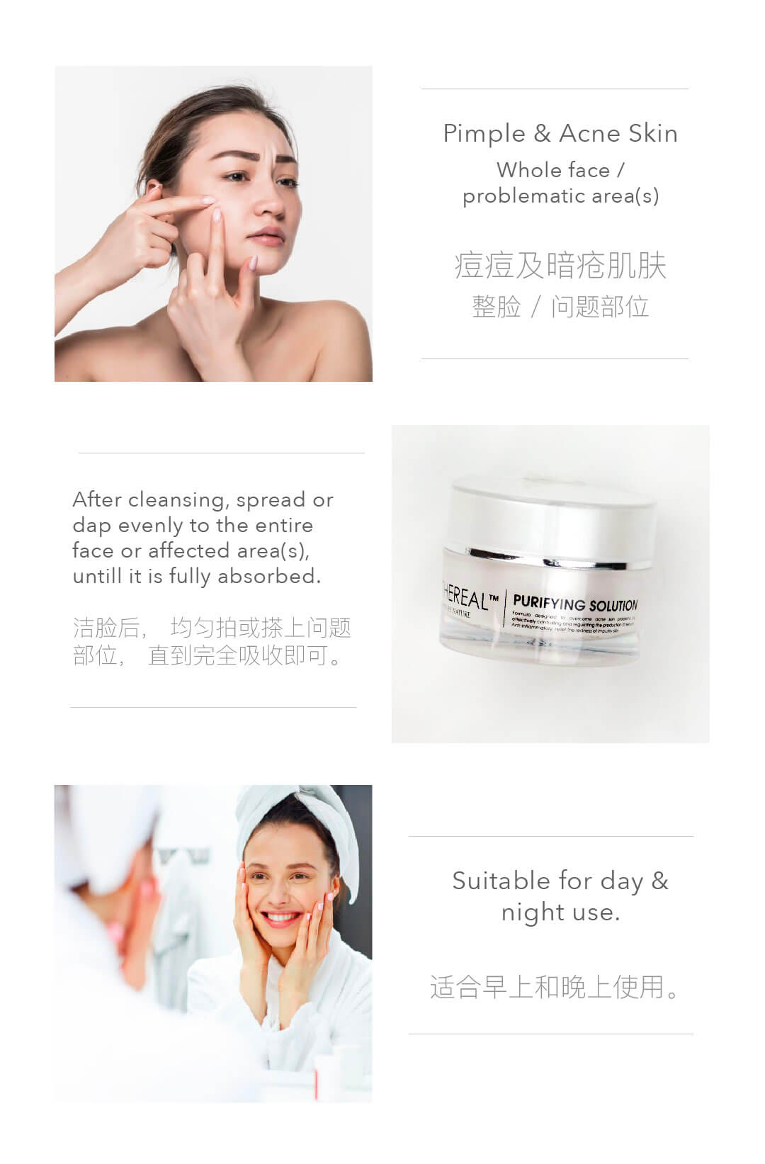 Combat acne concerns with our Purifying Solution. Formulated with Eucalyptus, Witch Hazel, and other plant-based ingredients, it regulates sebum production and offers anti-bacterial and anti-inflammatory properties, effectively reducing redness.