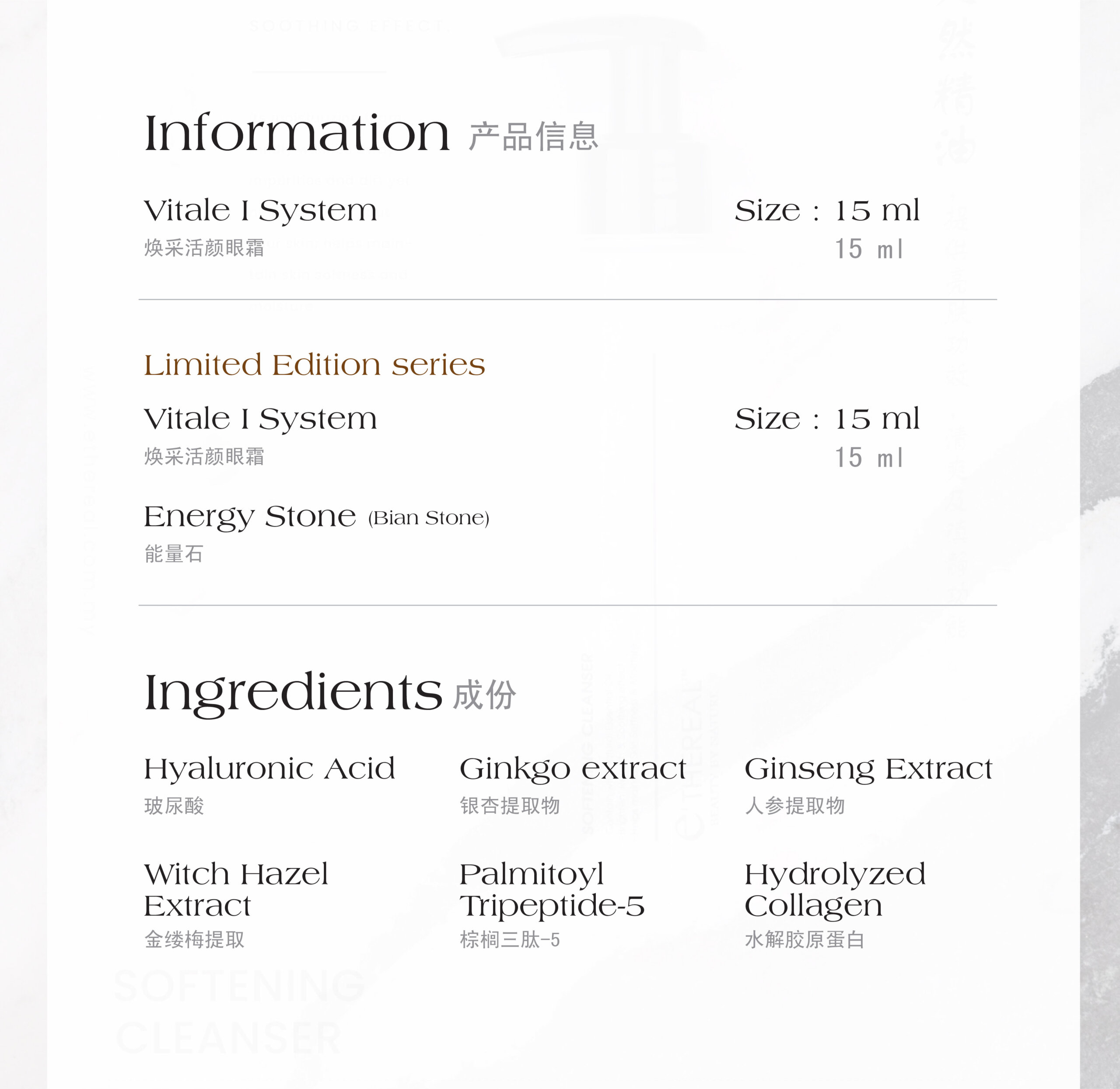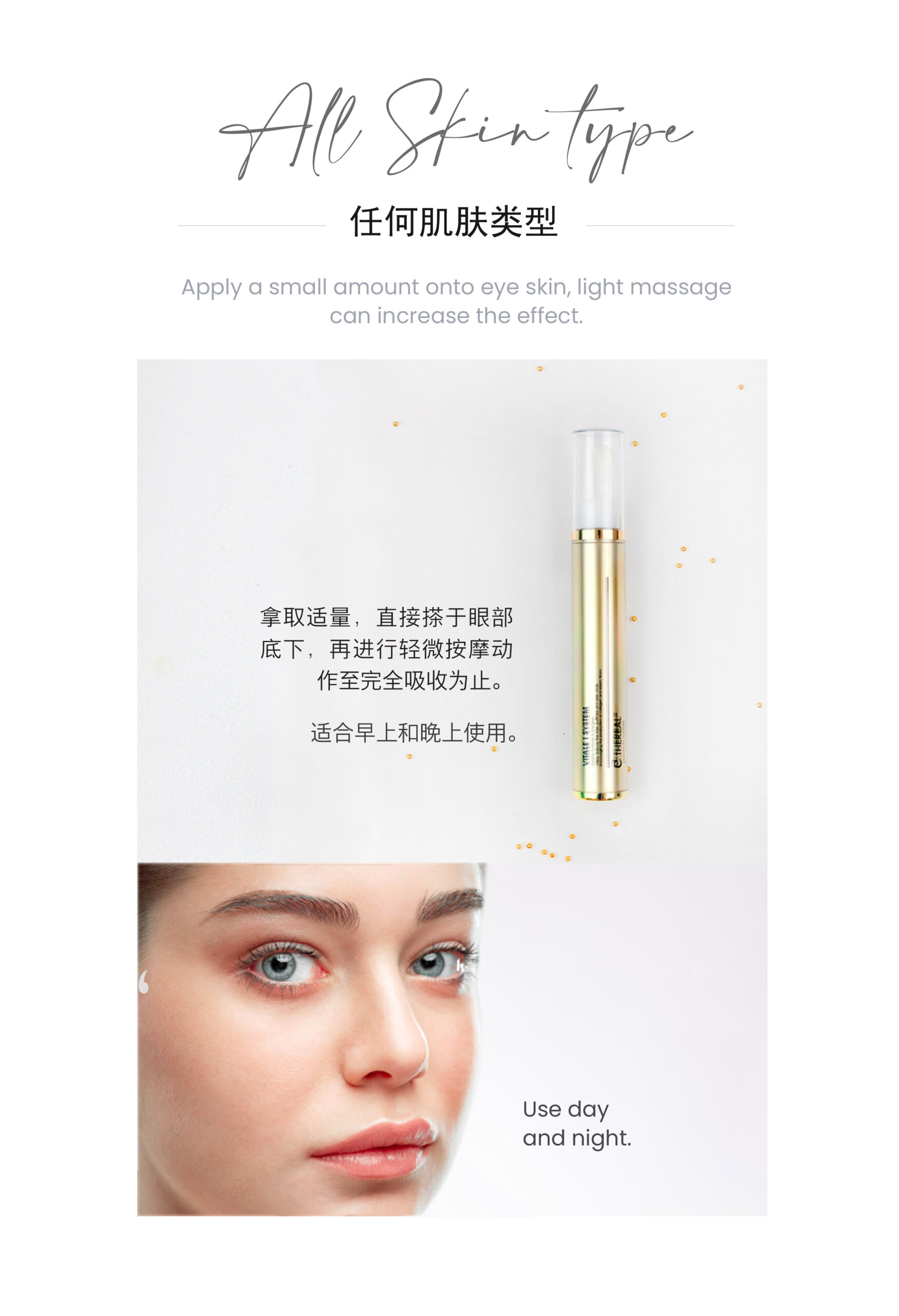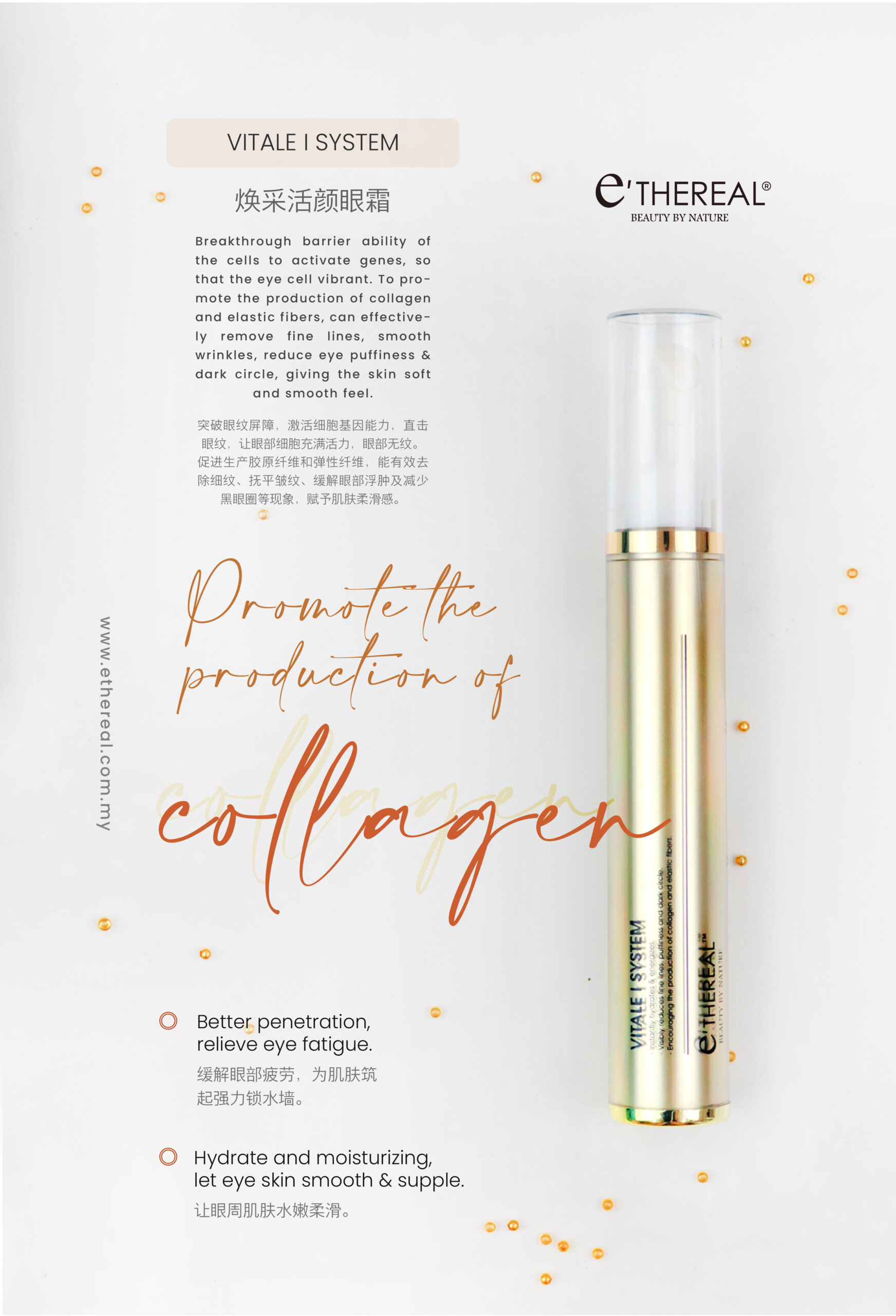 Defend against digital eye fatigue with our Vital I System. It diminishes the appearance of dark circles with Gingko extract, reduces eye puffiness with Witch Hazel extract by improving blood circulation around the eyes. Meanwhile, it smooths fine lines and crow’s feet wrinkles around the eyes with the inclusion of Ginseng extract, Palmitoyl Tripeptide-5, and Hydrolyzed Collagen. Use it consistently to keep your eyes looking vital and lively!