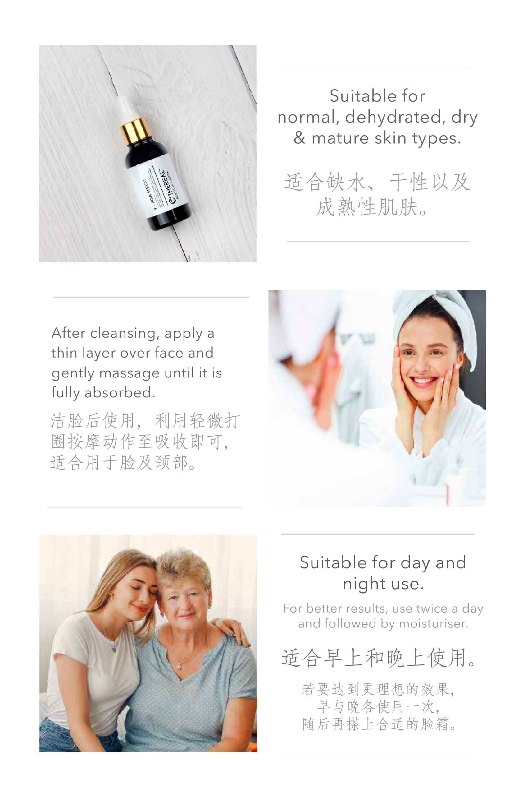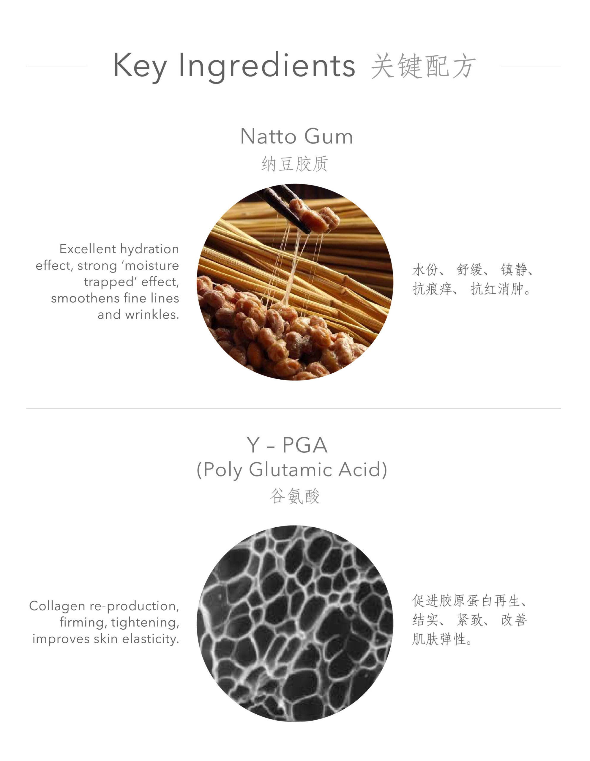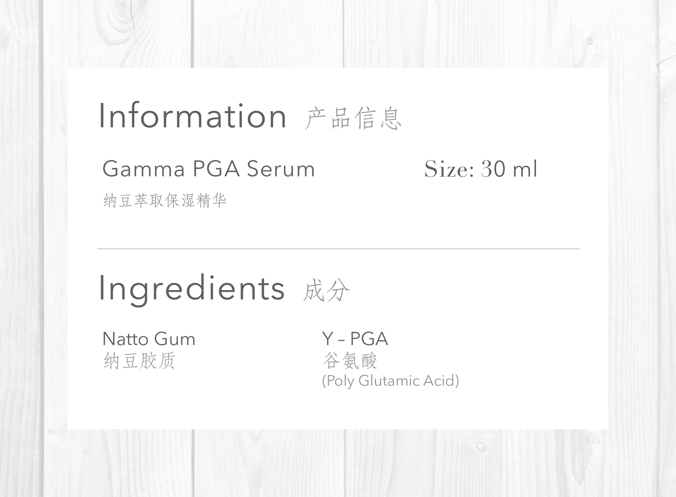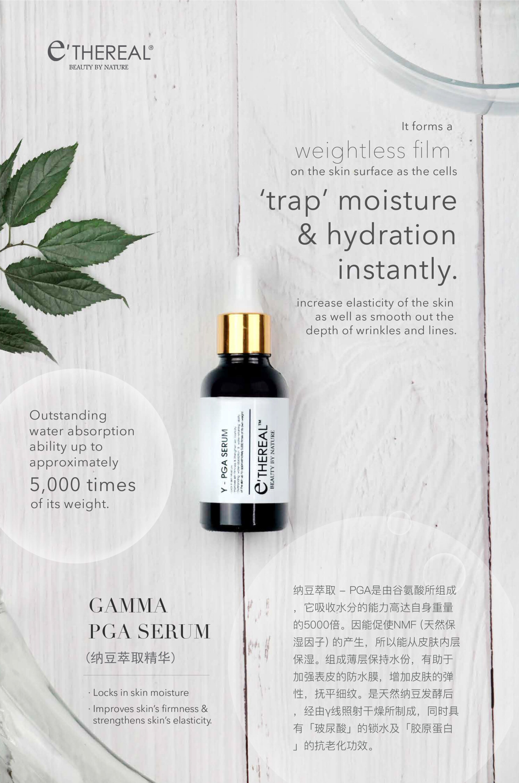 Experience superior hydration with Natto’s Poly Glutamic Acid (y-PGA)! Feel the ‘absorption’ when applying Gamma PGA Serum on your skin. Research has shown that y-PGA has an outstanding ability to draw moisture, approximately 5,000 times its weight, from the air into the upper layer of your skin, forming a weightless film. Simultaneously, it helps reduce wrinkles and fine lines by keeping your skin consistently hydrated.